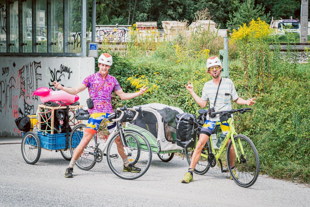 Sauf que les deux amis, accompagnés de Damien Largeron, leur caméraman, entendent performer dans la bonne humeur : quoi de mieux que le vélo et la compagnie Kroux et Bintje, leurs chiens, pour relier les 3 voies mythiques ?